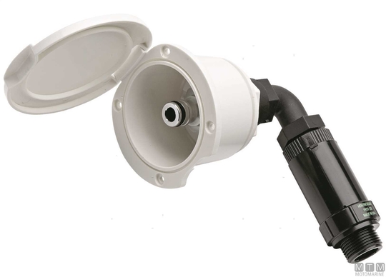 Recessed quick coupling inlet water box in shockproof white or chromed plastic. With 3 Bar 3/4" threaded pressure reducer to avoid pipes damaging when connecting boat water circuit to the dock water circuit.